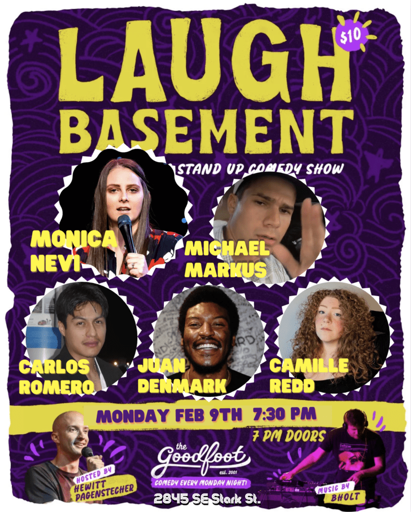 Laugh Basement, our weekly stand-up comedy showcase hosted by Hewitt Pagenstecher and DJ Bholt, is back with headliner Monica Nevi!! Monica is regularly touring nationally and internationally and can be seen performing in clubs, colleges and theaters across the country. The Seattle-based comedian's debut special “Big Stepdad Energy” (Helium Studios) was released in October 2022, and was immediately voted top 50 specials of the year by We Own The Laughs magazine. Monica debuted two albums in late 2020 within one month of each other. Her first standup album, Mostly Finger Guns, followed by her debut comedic guided meditation, Chill. Both went #1 on the comedy charts. Monday’s show also features comedians Juan Denmark, Michael Markus, Carlos Romero, and Camille Redd! $10
